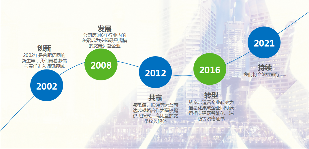 合肥市億網(wǎng)科技有限公司于2002年新生于合肥市區(qū)重點高校園區(qū)內(nèi),起始團(tuán)隊只有數(shù)名成員。歷經(jīng)二十載的歲月沉淀,回望來路發(fā)展道路幾多艱難,億網(wǎng)人披荊斬棘,努力奮斗,緊跟時代發(fā)展的腳步,成功轉(zhuǎn)型為以“互聯(lián)網(wǎng)+”為支撐平臺的智能化科技型公司。